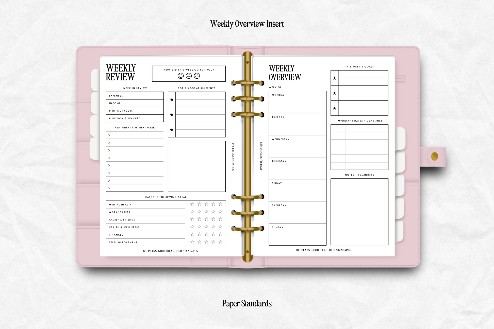 - Layout includes weekly overview cover with a weekly review on the back